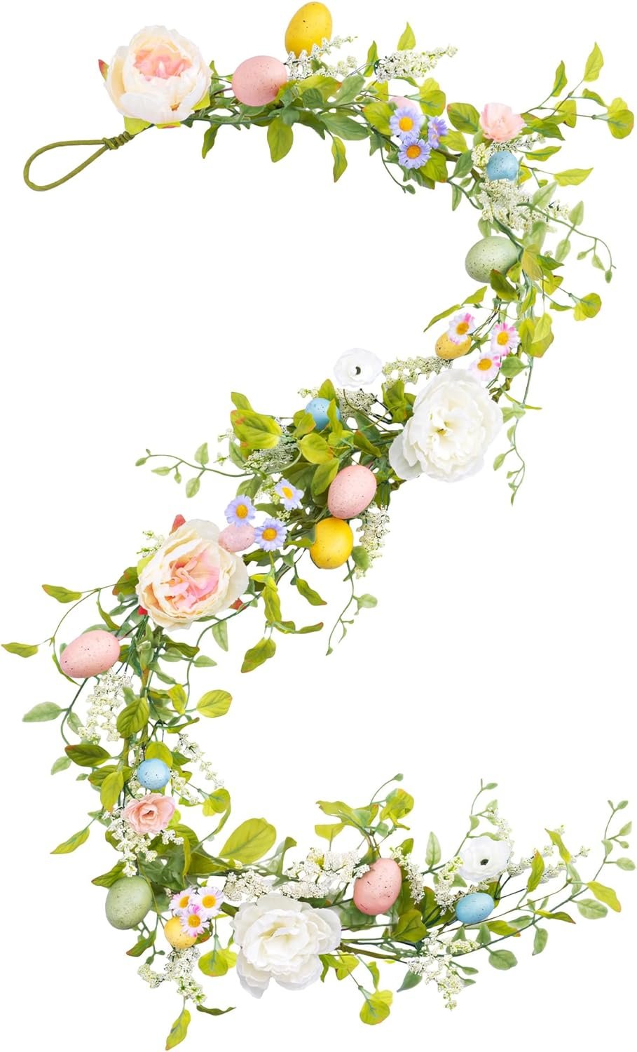 6Ft Easter Peonies Garland, Artificial Easter Egg Garland with White Flowers Peonies Stamens for Indoor Outdoor Home Fireplace Decoration