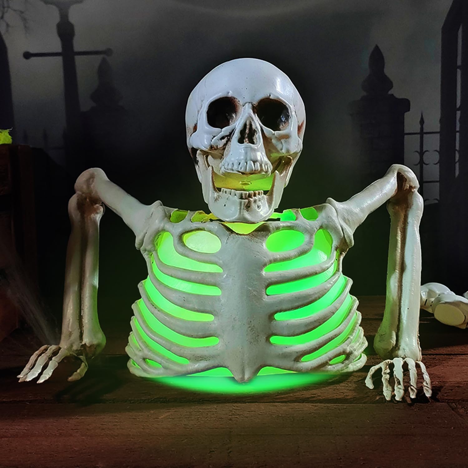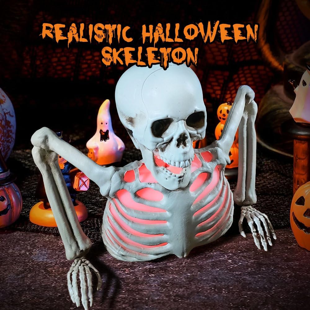 Lighting Design: This skeleton has four colors of light, red light, green light, purple light and blue light. This transition of different colored lights gives your Halloween scene more atmosphere!
