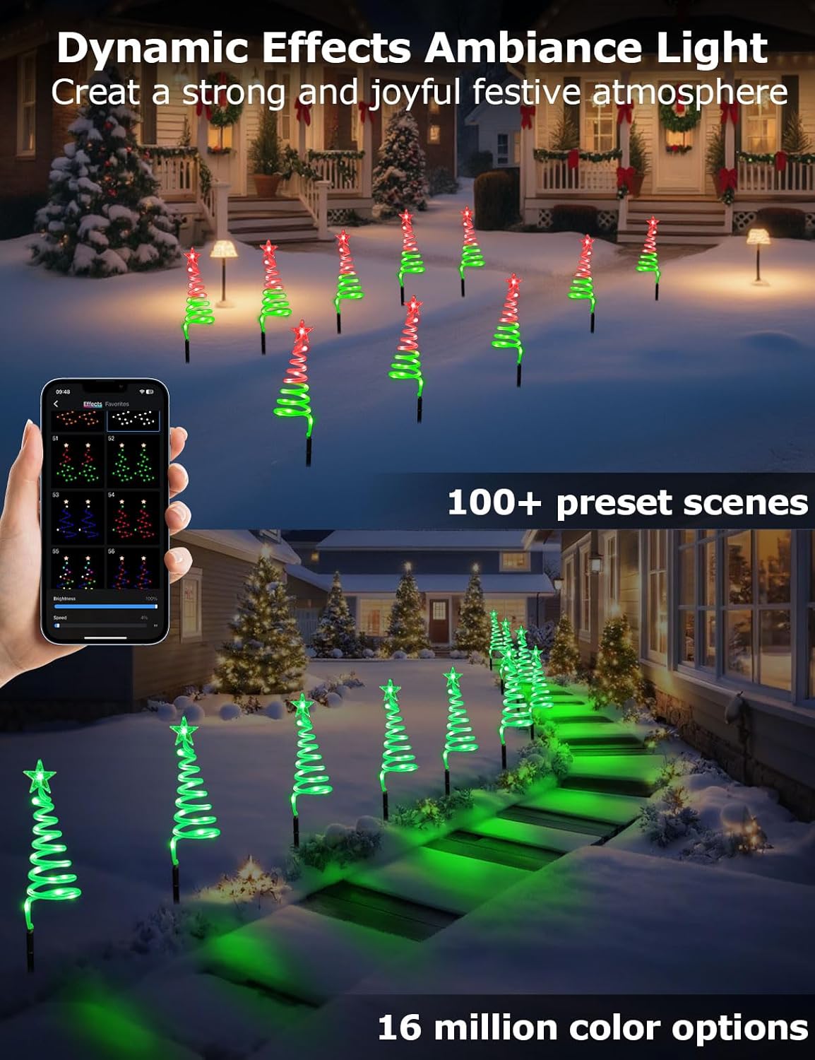 DIY RGBW Spiral Christmas Tree Pathway Lights: Innonly Smart pathway Christmas lights features RGB chip beads and offer DIY mode, 100+ preset scenes and 16 million colors to program 150 LEDs’ color, dynamic or static lighting, speed, and brightness to create your favorite lighting animations. Suitable for all outdoor holiday decorations themes.