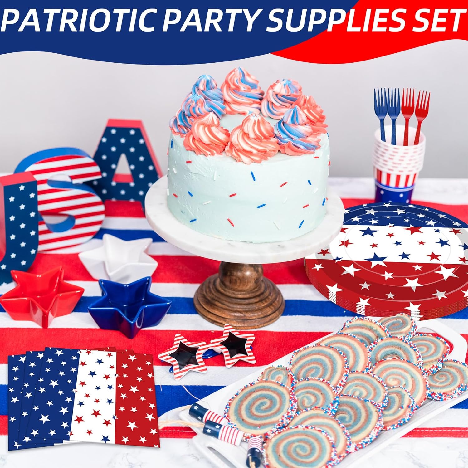 100 Pcs Patriotic Party Supplies Set, Serves 25 – Disposable Red White Blue Star Paper Plates, Napkins, and Forks, American Flag Themed Tableware for 4th of July, Memorial Day, Labor Day Decorations