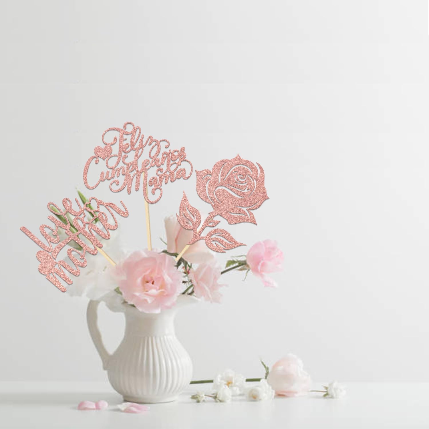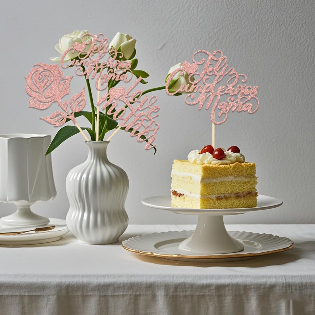 12Pcs Feliz Cumpleaños Mama Table Decoration Happy Mother’s Day Centerpiece Sticks Happy Mom Birthday Table Decoration Rose Gold Glitter
