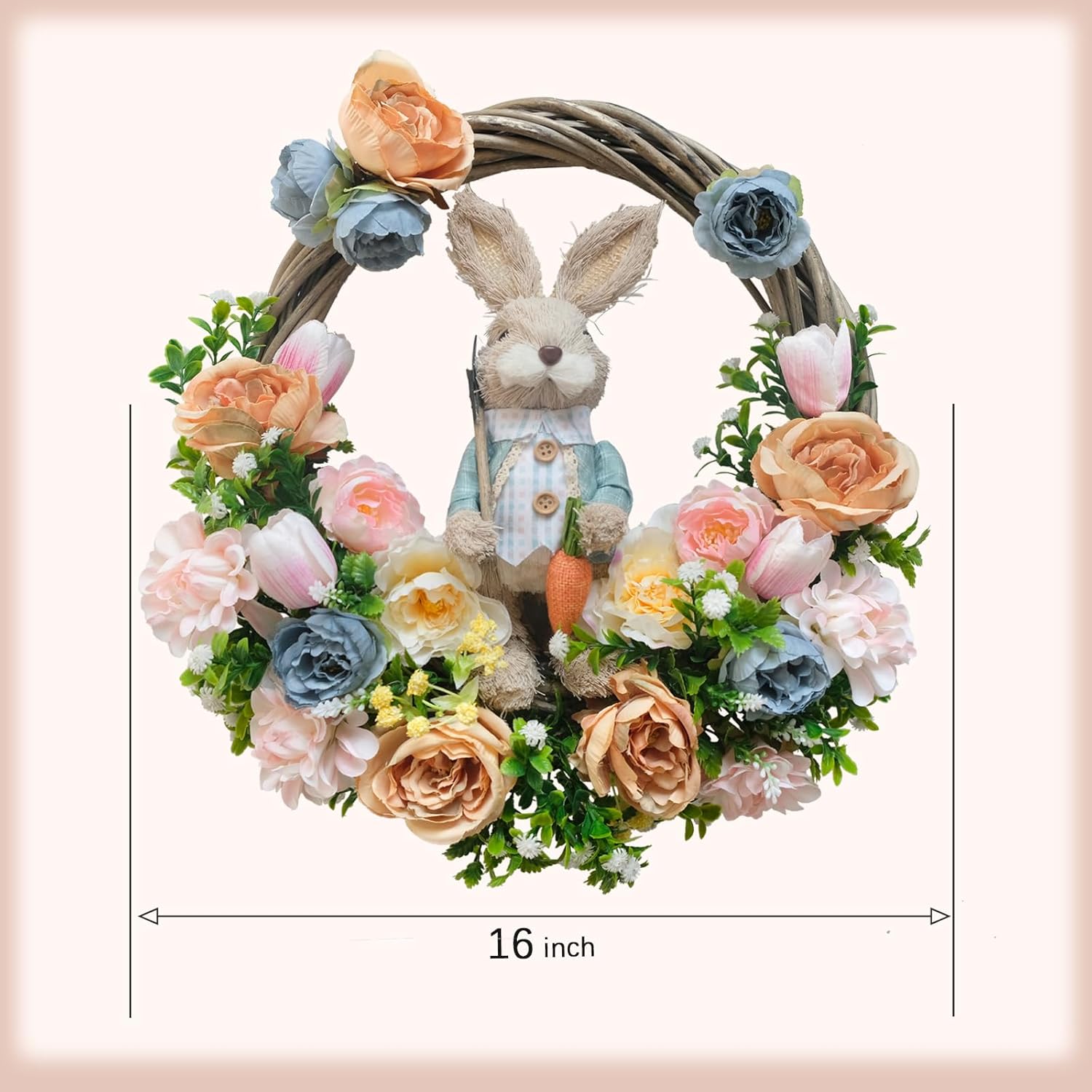 16 Inch Spring Easter Wreath with Artificial Easter Bunny. Rabbit Wreath for Front Door Farmhouse Bunny Decorations with Silk Tulips Roses Grapevine for Home Door Garden Party Decorations