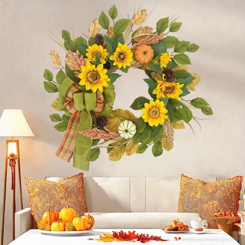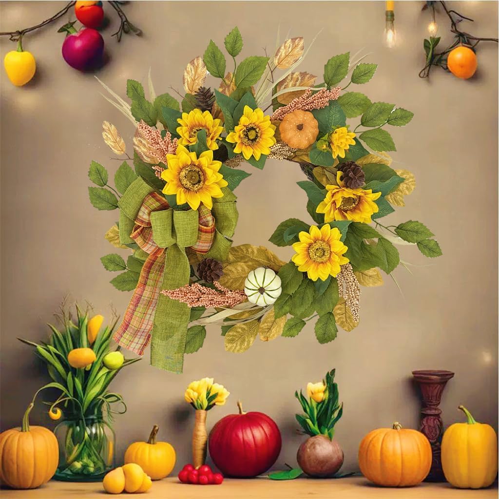 20 Inch Fall Wreath for Front Door, Sunflower Autumn Wreath with Pumpkins and Bow for Thanksgiving Farmhouse Home Window Wall Office Wedding Indoor Outdoor Decorations