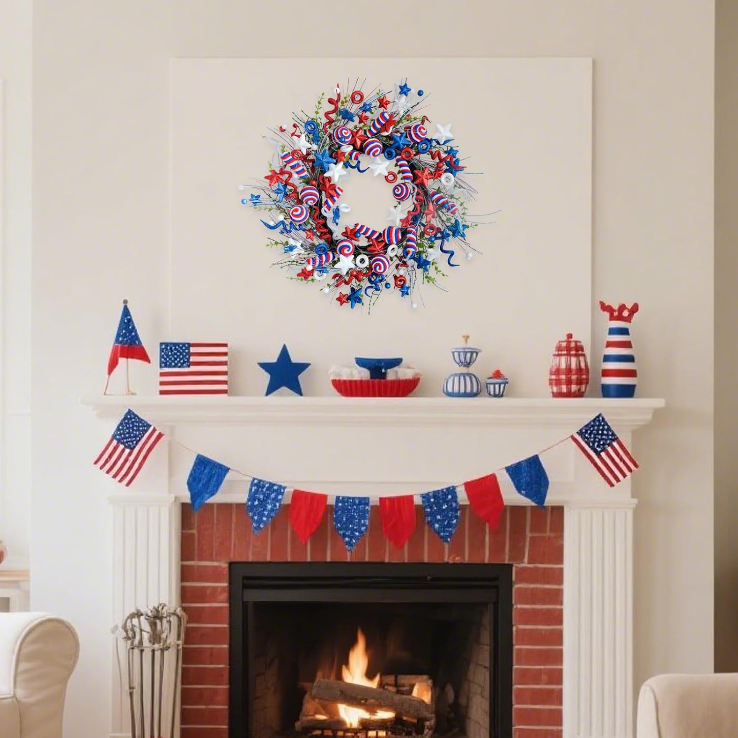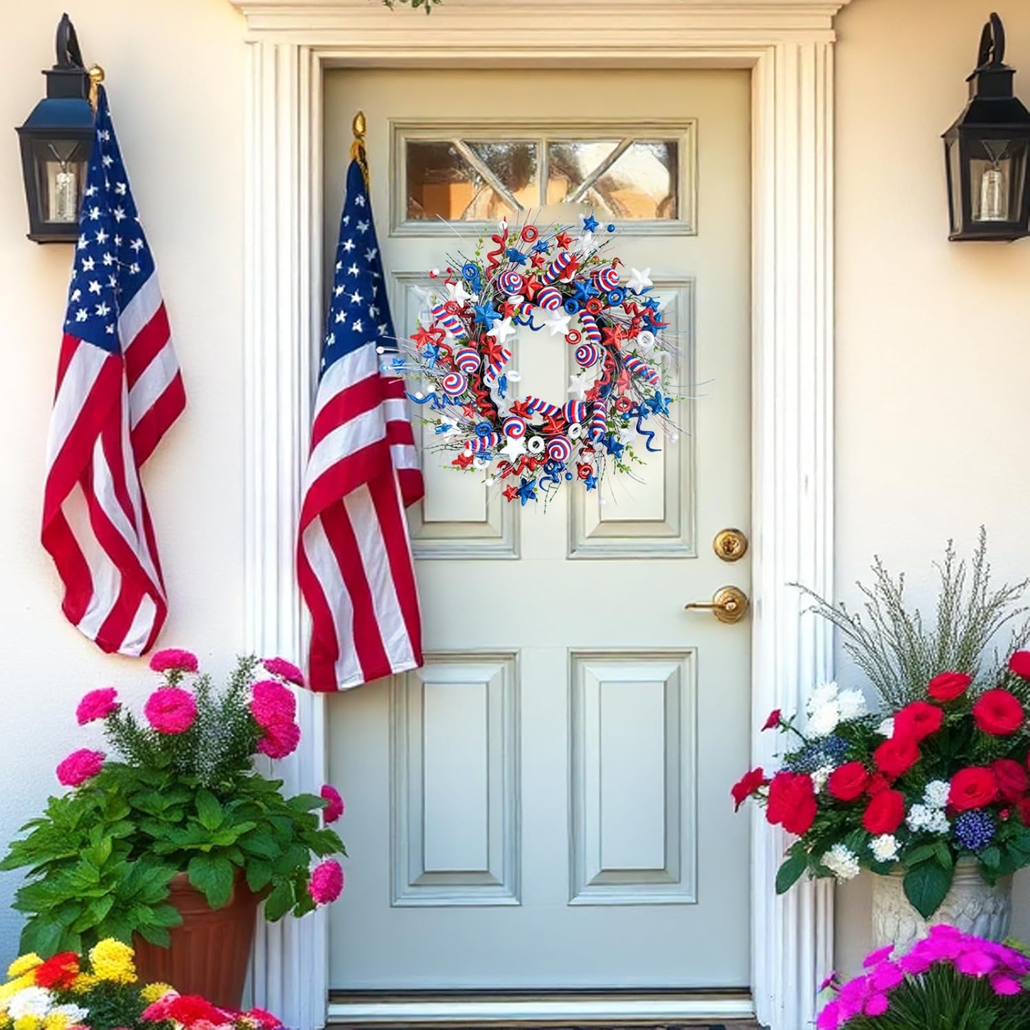 Overflowing with Joyous Atmosphere: This wreath is carefully crafted by integrating rich patriotic elements. Shining stars are dotted among spiral decorations and lollipop-shaped balls, with every detail exuding vitality, infusing your space with a strong festive and joyous atmosphere