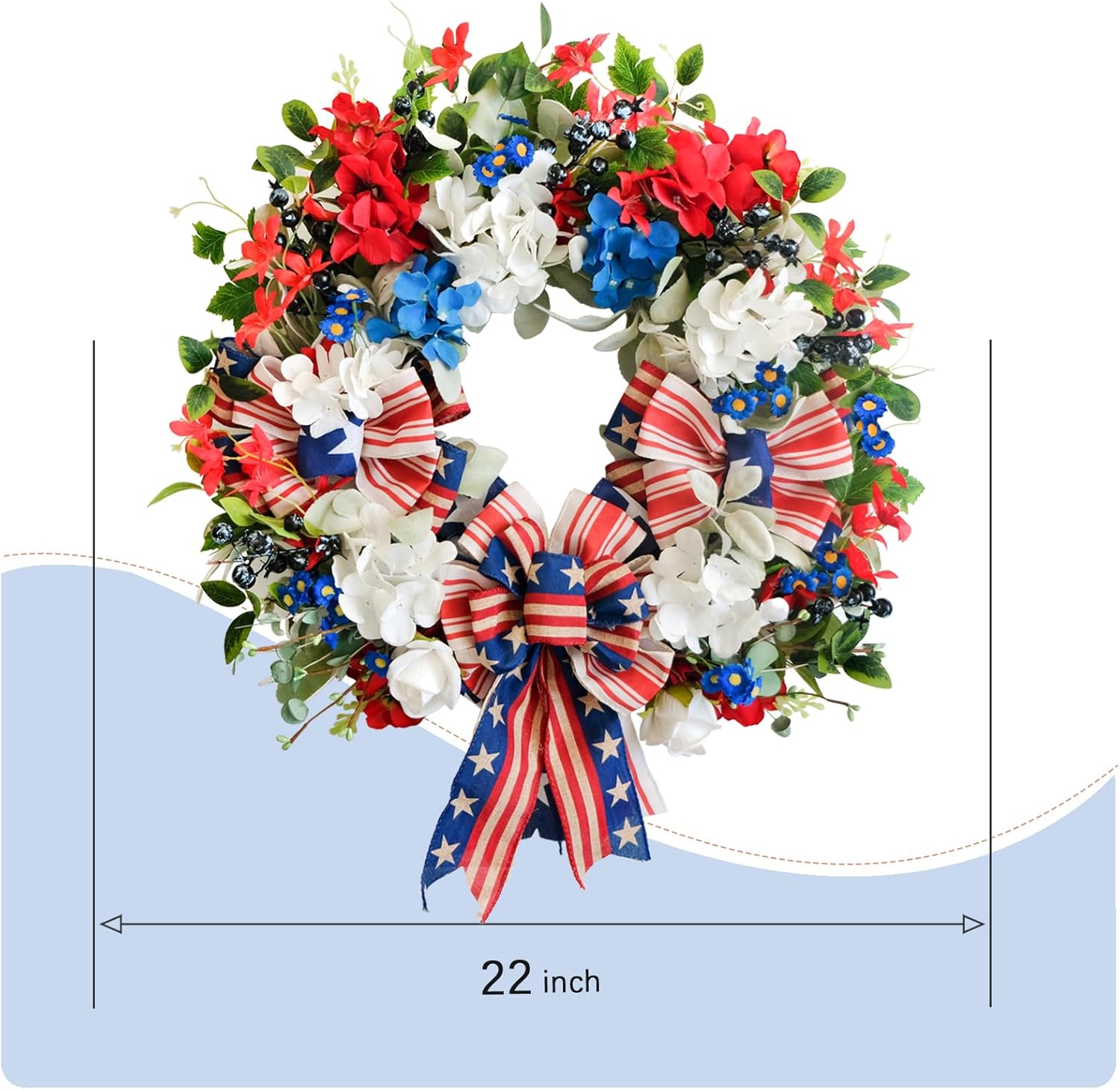 22 Inch Patriotic Summer Wreath for Front Door 4th of July Wreath with Red White Blue Hydrangea Flag Bowknot Wreaths for Memorial Day Independence Day Home Decor