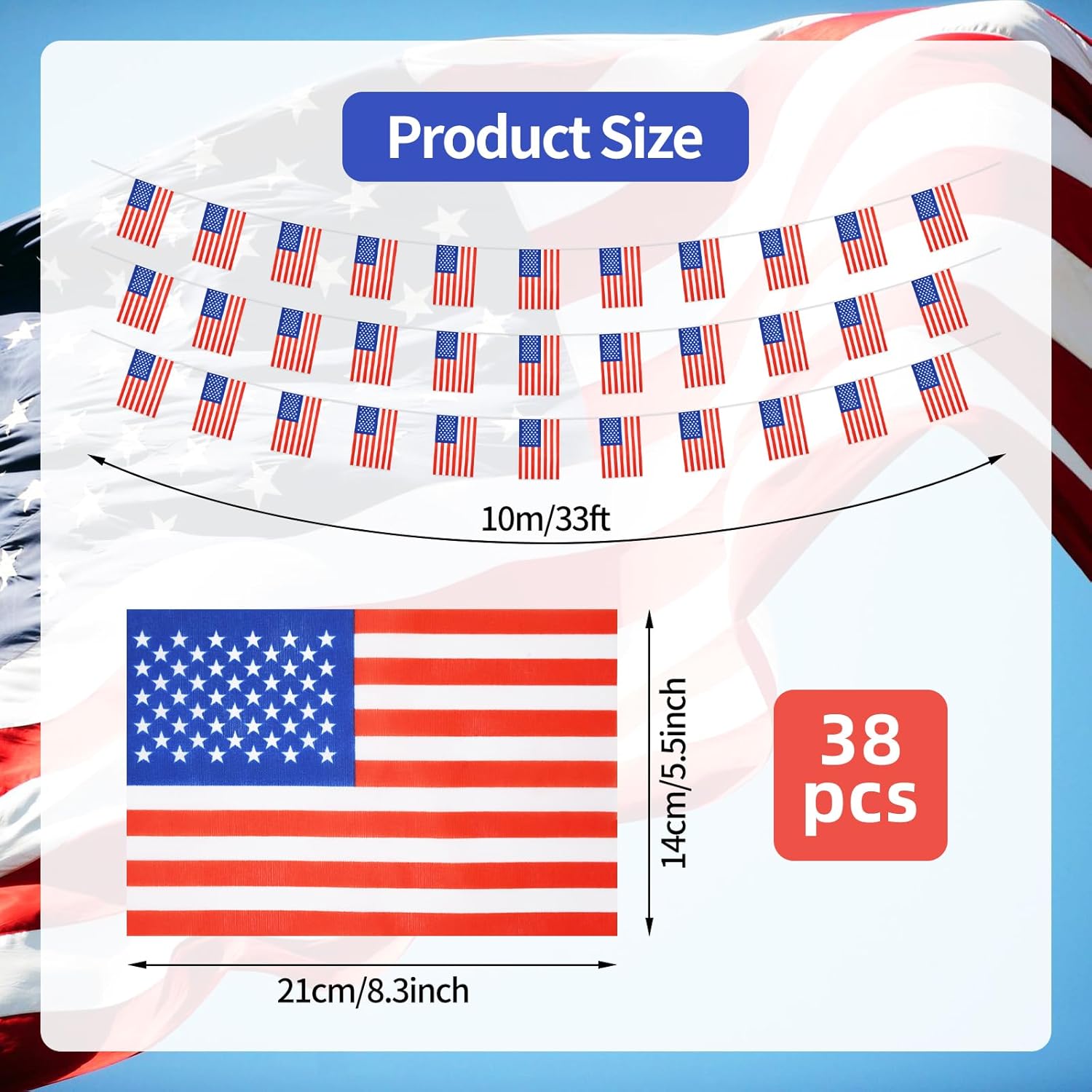 Perfect Size Rectangular Flags – The 32.8ft rectangle USA flags banner consists of 38 small American rectangular flags. Each flag measures 14cm/5.5 inches in width and 21cm/8.2 inches in length. The length is suitable for both indoor and outdoor use, and the flags can be easily cut into smaller pieces if desired.