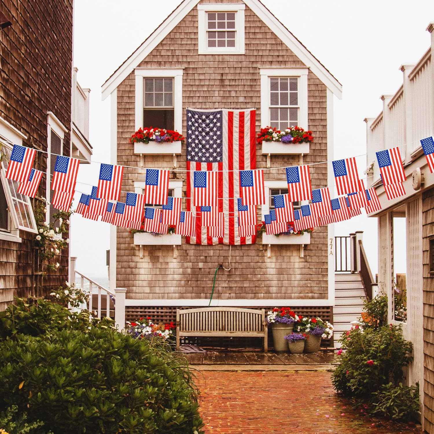 Premium USA Flags Banner – Crafted from durable polyester fabric and connected by sturdy satin ropes, our USA flags banner is designed to withstand outdoor conditions. It is fade-resistant and can withstand strong winds, rain, and sun exposure, ensuring it remains in great condition throughout your 4th of July Independence Day, Memorial Day, Veteran Day, and other patriotic decorations.