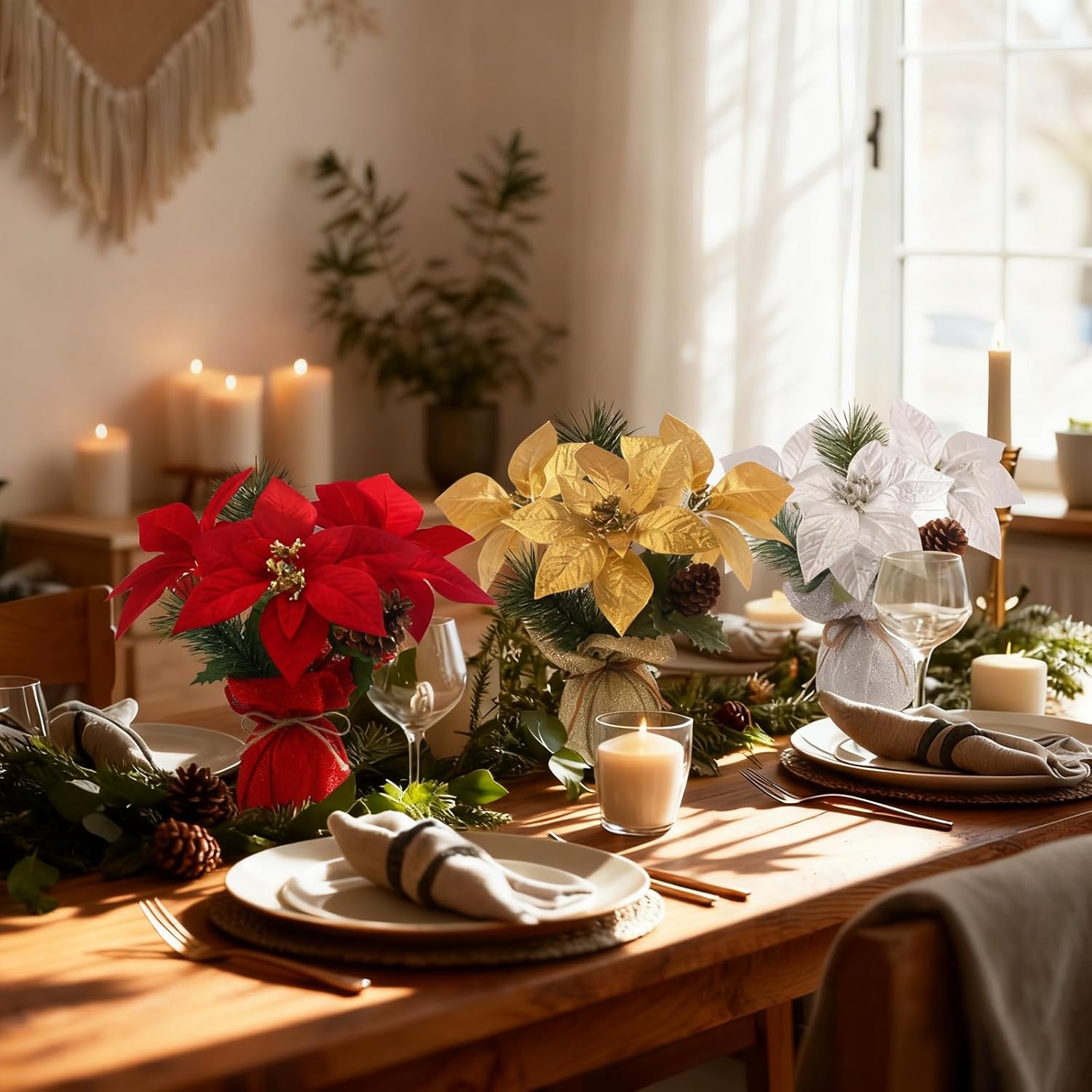 [Lifelike & Seasonal Charm] Crafted from high-quality gauze, plastic, satin, real pinecones, and foam, this charming fake poinsettia plant maintains its vibrant colors and full appearance all season long. As beautiful christmas faux flowers, they add a festive spirit without any watering or maintenance!