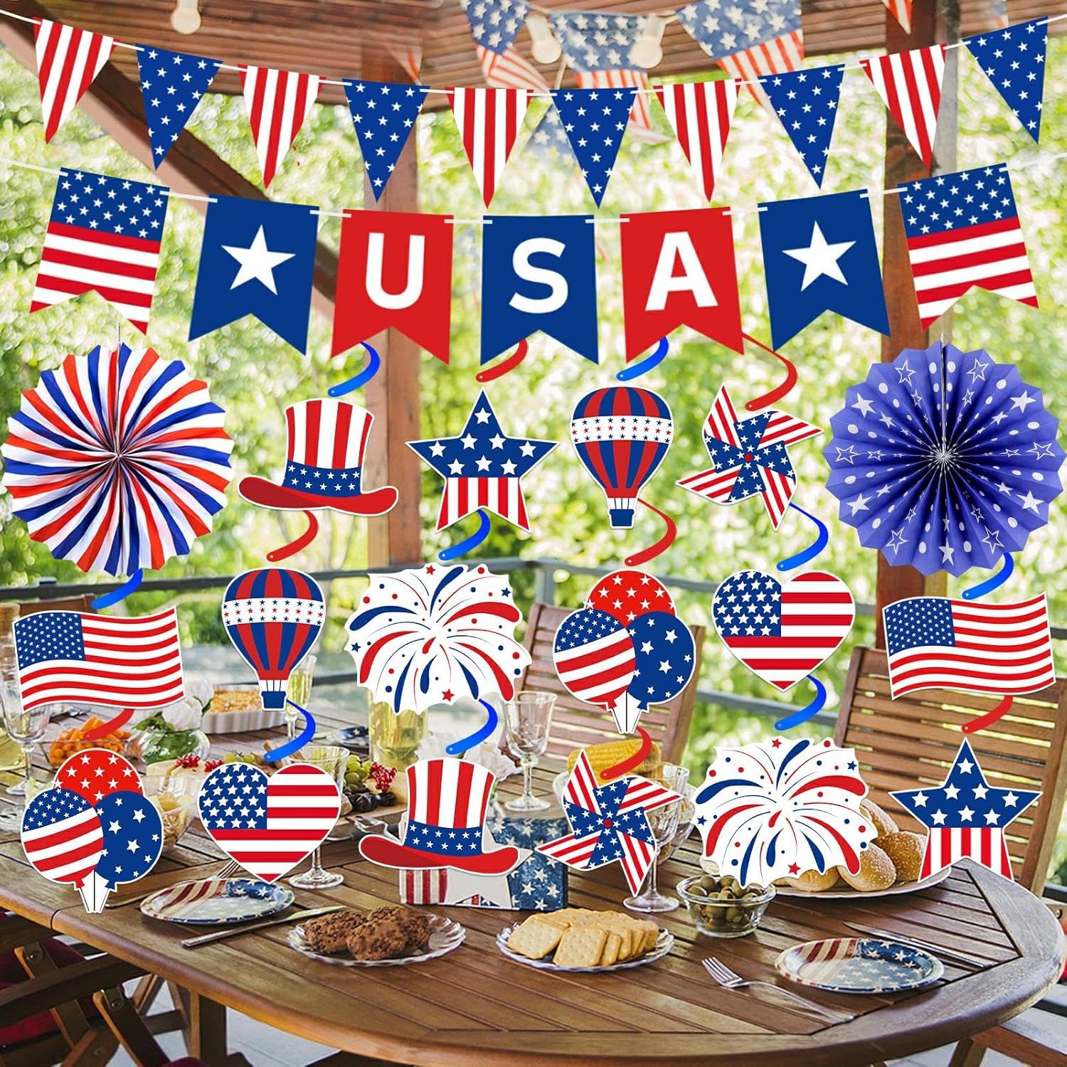 4th of July Decorations: Includes 1 string of USA banner, 1 string of american pattern pennant, 2 paper fans, and 16 Hanging Swirl Charms. Great for showing your patriotism.