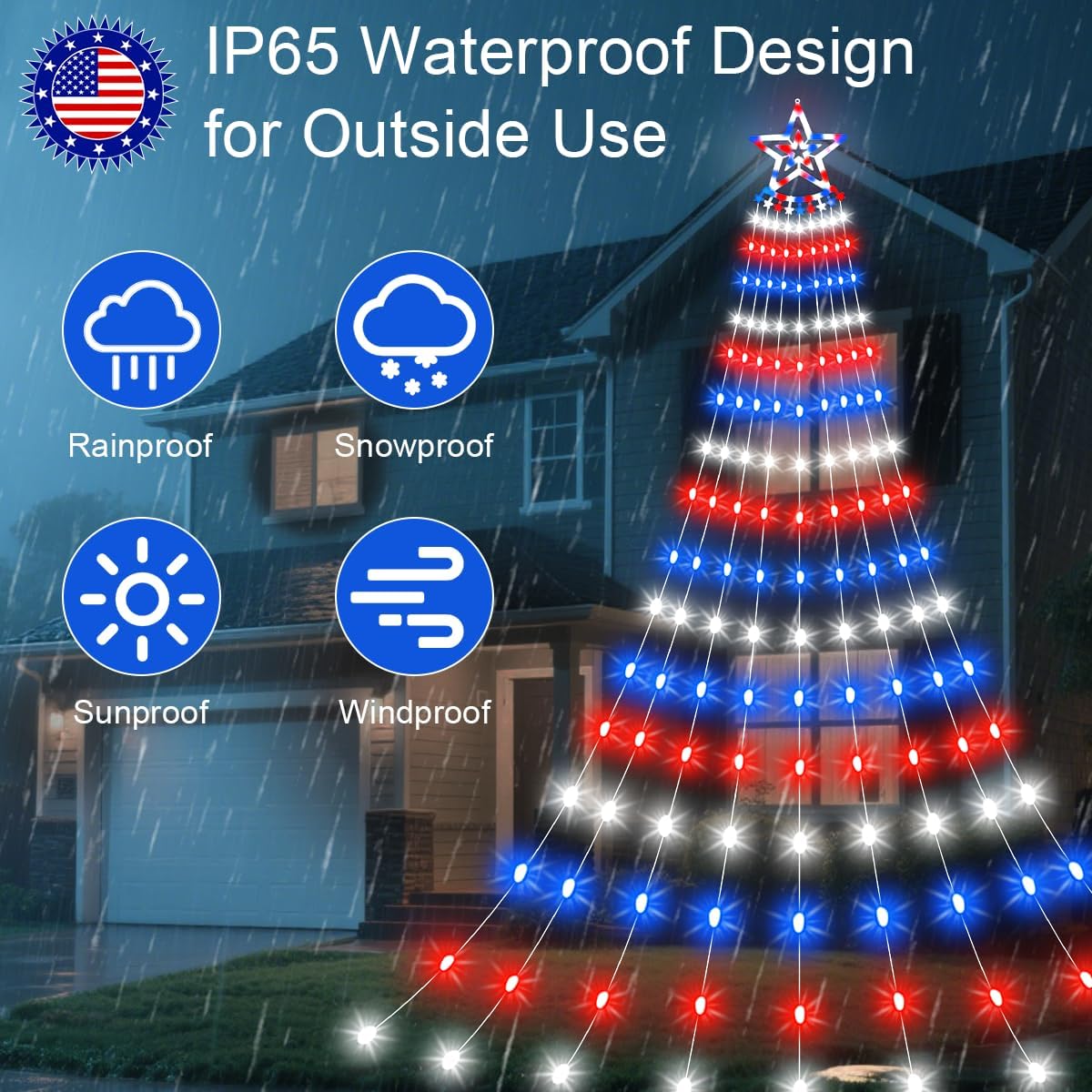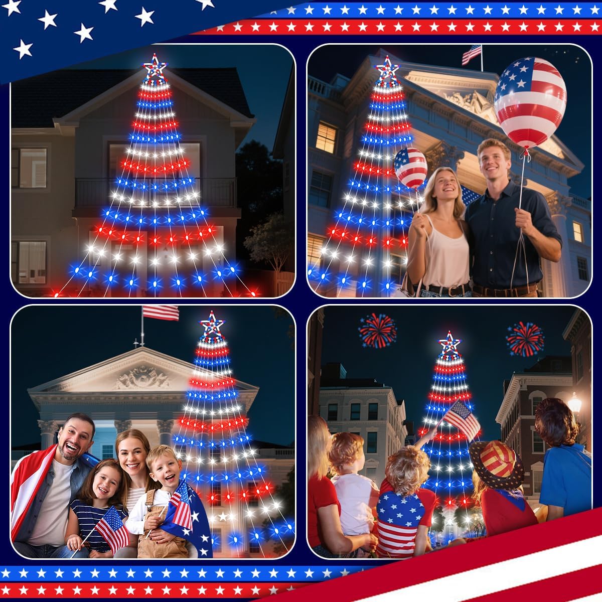 Indoor and Outdoor Decorations: This patriotic lights are very widely used. It completely fit for tree, Yards, garden, porches, patio, roof, wall, window, living room, bedroom, wedding, birthday, party, National Day, Veterans Day, Labor Day, Flag Day, etc.