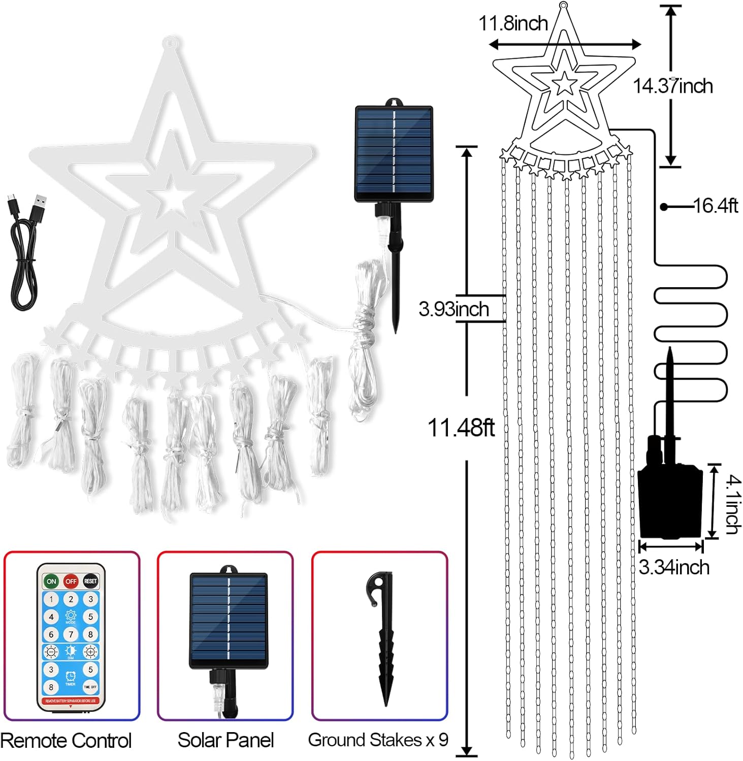 4th of July Decorations Solar Waterfall Lights: This 4th of July lights have 350 super bright red white blue LED bulbs, distributed in 9 strings. The top star diameter is 11.8 inch. Length of each string: 11.48 feet. The plug cable length: 16.4ft. Perfect size for you to decorate your house or yard, creating a strong patriotic atmosphere