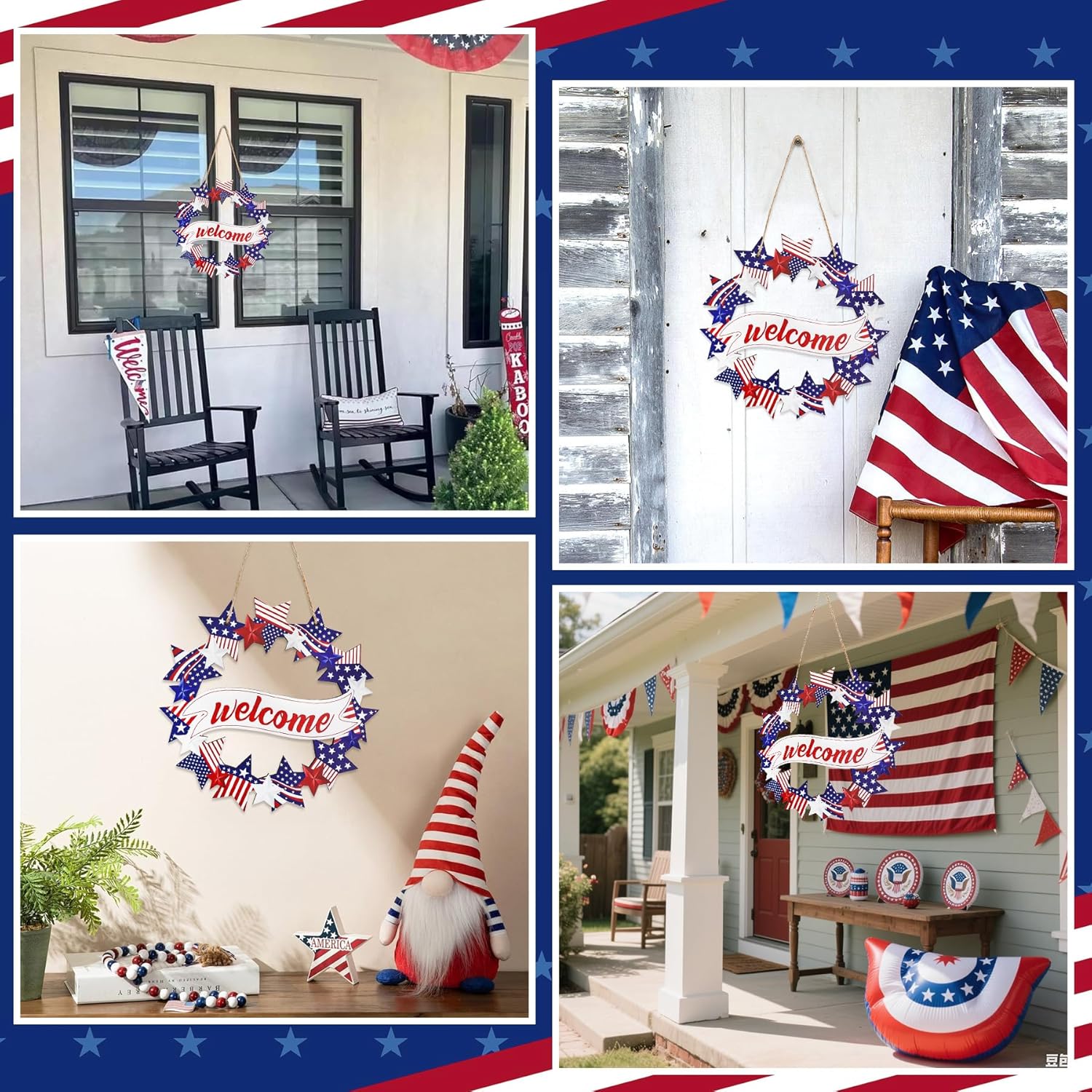 Warm and Lively Patriotic Design: The wooden wreath decoration is surrounded by various patterns of stars in the shape of a wreath, with a welcome in the middle, welcoming guests and representing the lively atmosphere of Independence Day.