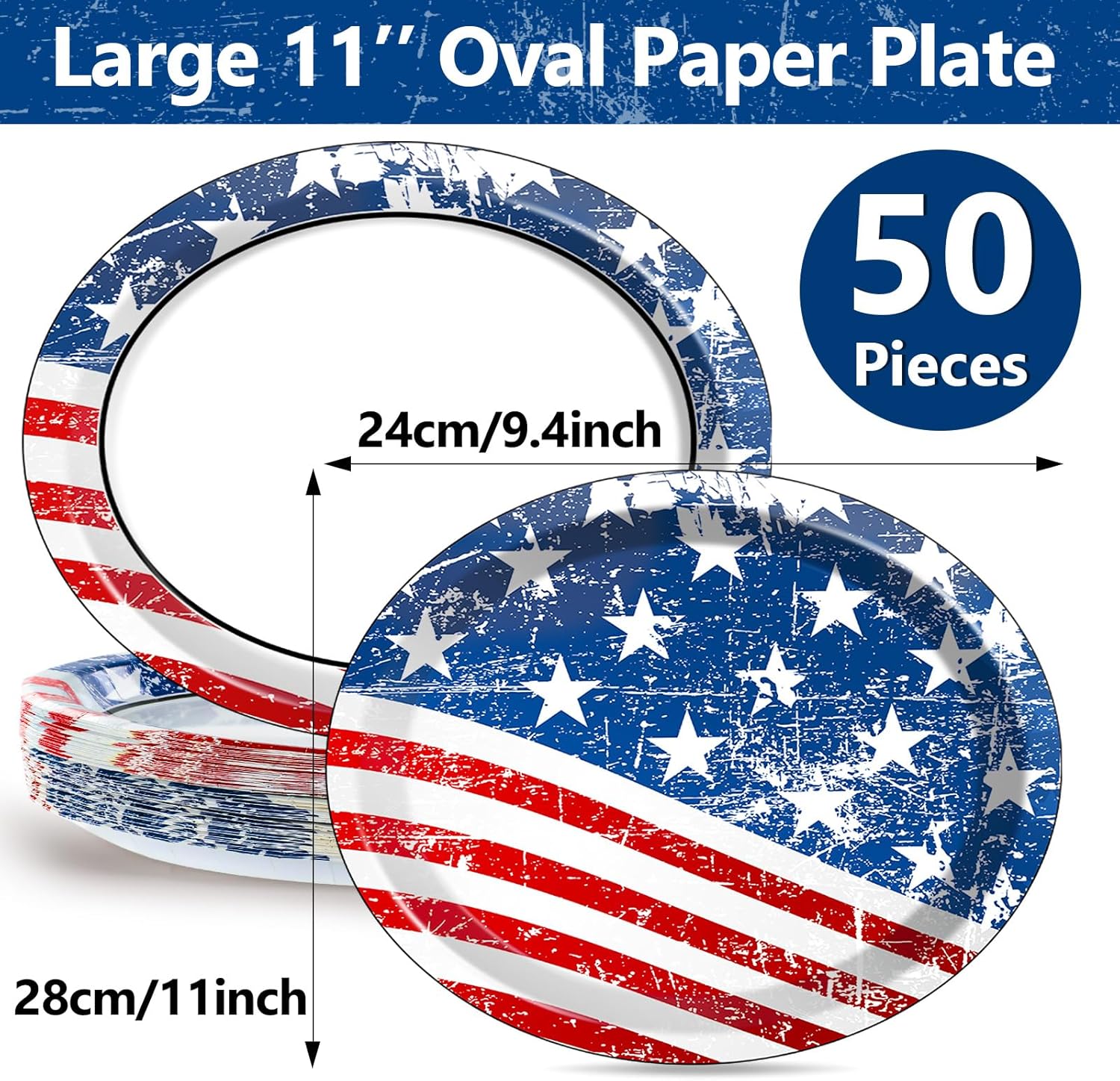 50 PCS Patriotic Oval Paper Plates Large 11’’ Disposable American Flag Platters, 4th of July Independence Day Heavy Duty Dish Tray for Memorial Day Picnic All Occasion Dinner Party Tableware Bulk Specifications: Material: paper Size: 11 inches Color: blue and red Package Includes: 50 x Oval Plate
