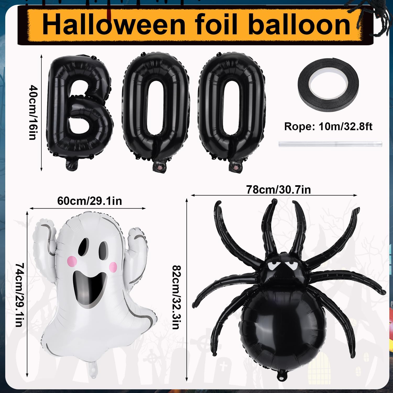 Package Includes: You will receive 9 pieces of Halloween balloons, including 1 set of “BOO” letter balloons, 4 ghost balloons, 2 spider balloons, 1 straw, and 1 roll of ribbon for easy setup.
