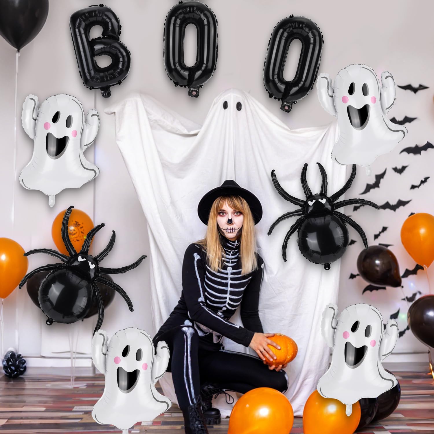 9pcs Halloween Balloons Set, White & Black BOO Ghost Spider Foil Balloons Cute Spooky Party Decorations for Halloween Birthday Baby Shower Supplies