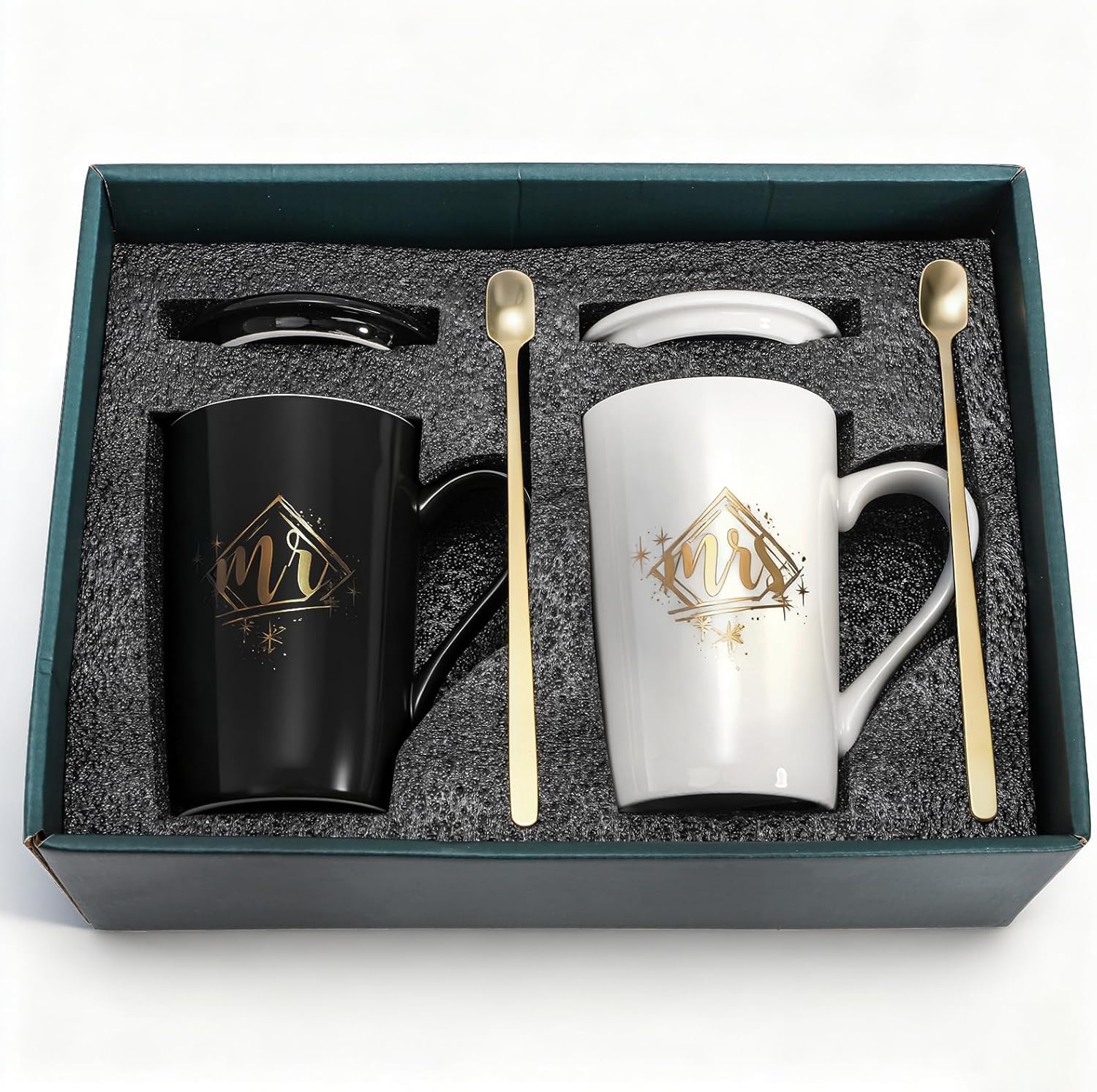 Perfect Wedding Gift Set: Includes 2 premium 14oz ceramic mugs (black & white), 2 sturdy matching saucers, and 2 delicate gold spoons, all exquisitely packaged in a luxury gift box with soft lining. An ideal present for newlyweds, anniversaries, engagements, and bridal showers.