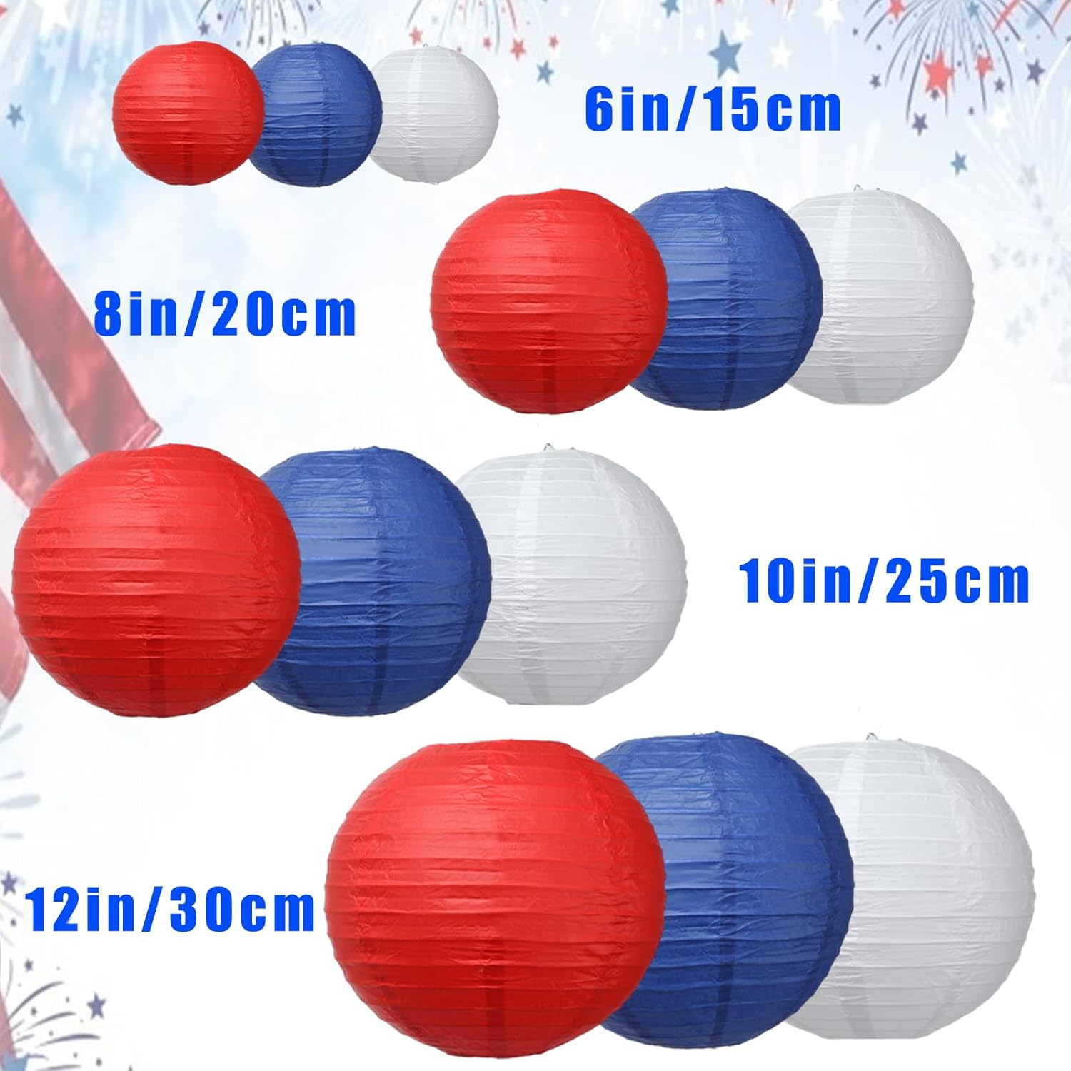 Assorted colors and sizes: Famolay 12 pcs patriotic paper lanterns come with 3 colors including 6”, 8”, 10” and 12”, each size includes red, blue and white lanterns, these color paper lanterns can give you a wide variety to make excellent backdrop or even just hung around the room.