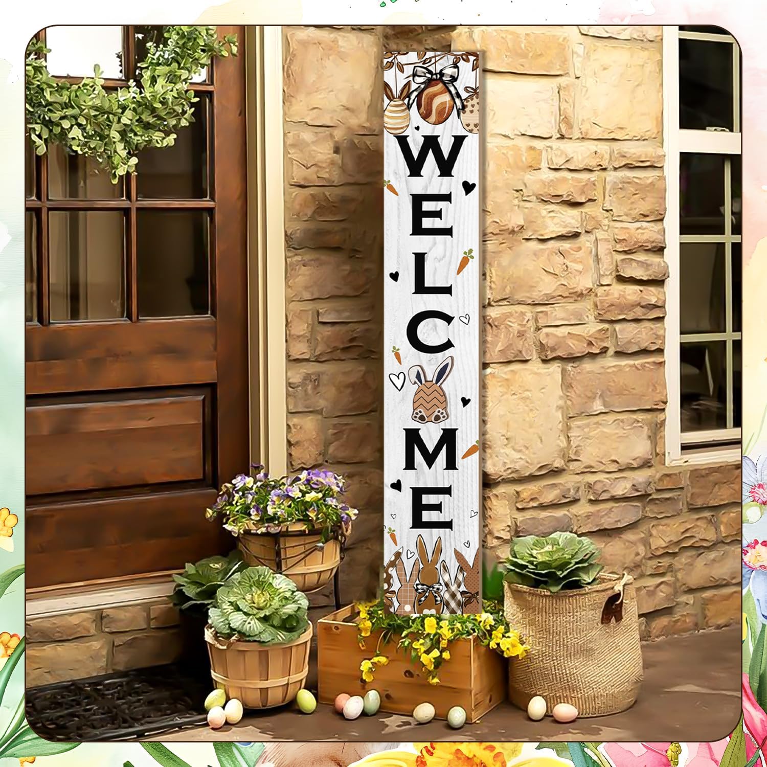 EASY INSTALLATION: The Easter welcome sign for front door garden vertical sign for front door is assembled by three pieces of wood boards of the same size, and the backs are connected together by screws. Each piece of these wooden porch signs measures 15.7 x 7.8 inches and has an assembled height of 47.2 inches or 3.9 feet. You need to assemble this welcome porch sign yourself, enough parts and tools are included in the package to help you complete the assembly.