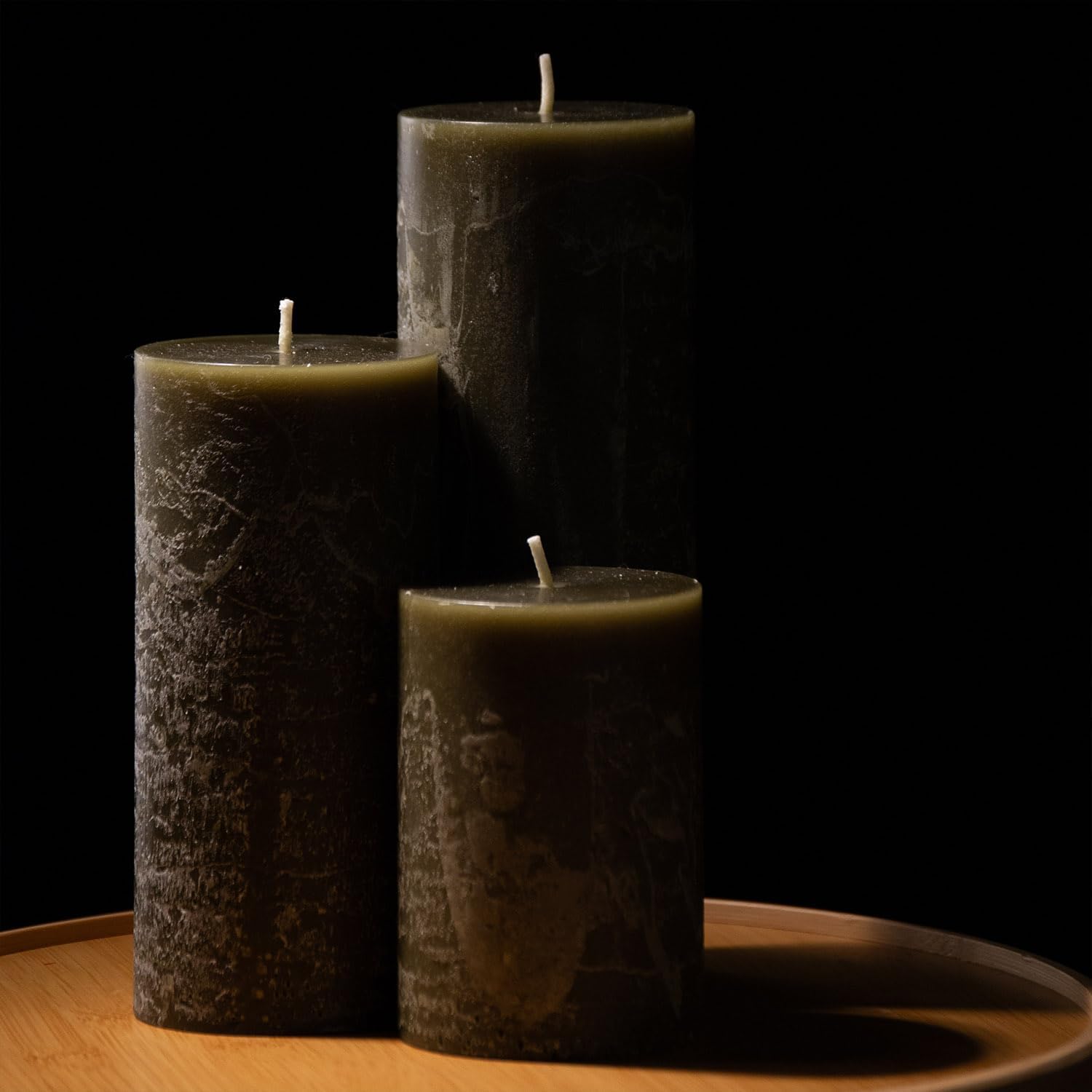 Estrella Blanca Dark Moss Green Unscented Pillar Candles, Set of 3 Different Size 3×4 3×6 3×8 inch, Long Lasting Fall Candles for Home