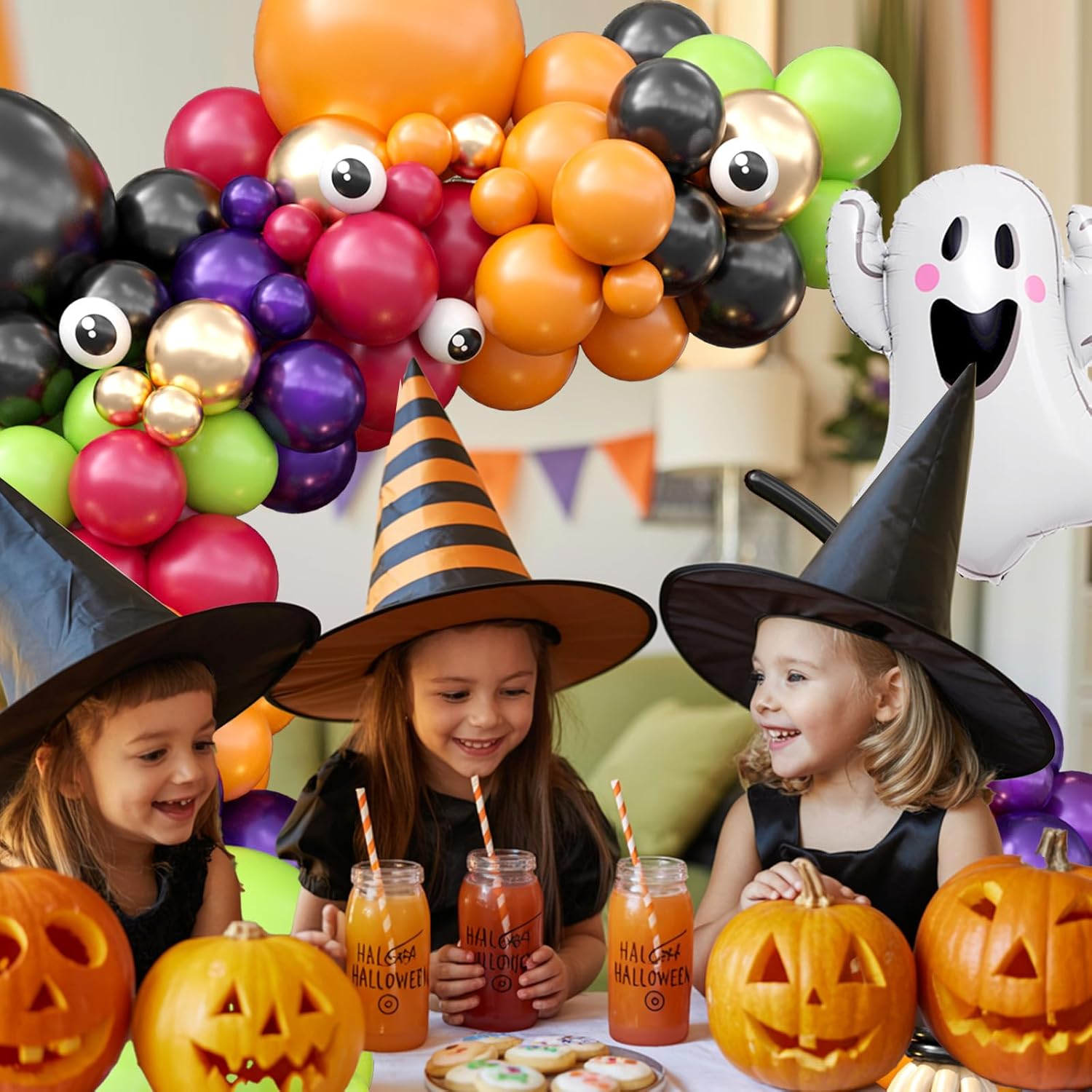 Halloween Balloon Arch Kit: This orange black green halloween balloons arch kit includes 3 x 18inch balloons (black, orange, green), 96 x 10inch and 5inch balloons (black, orange, green, hot pink, black purple, metallic champagne gold), 8 x 5inch eyeball balloons, 7 x long balloons (black, brown), 1 x ghost foil balloon, 1x silver ribbon, and 1 x 5m balloon chain.