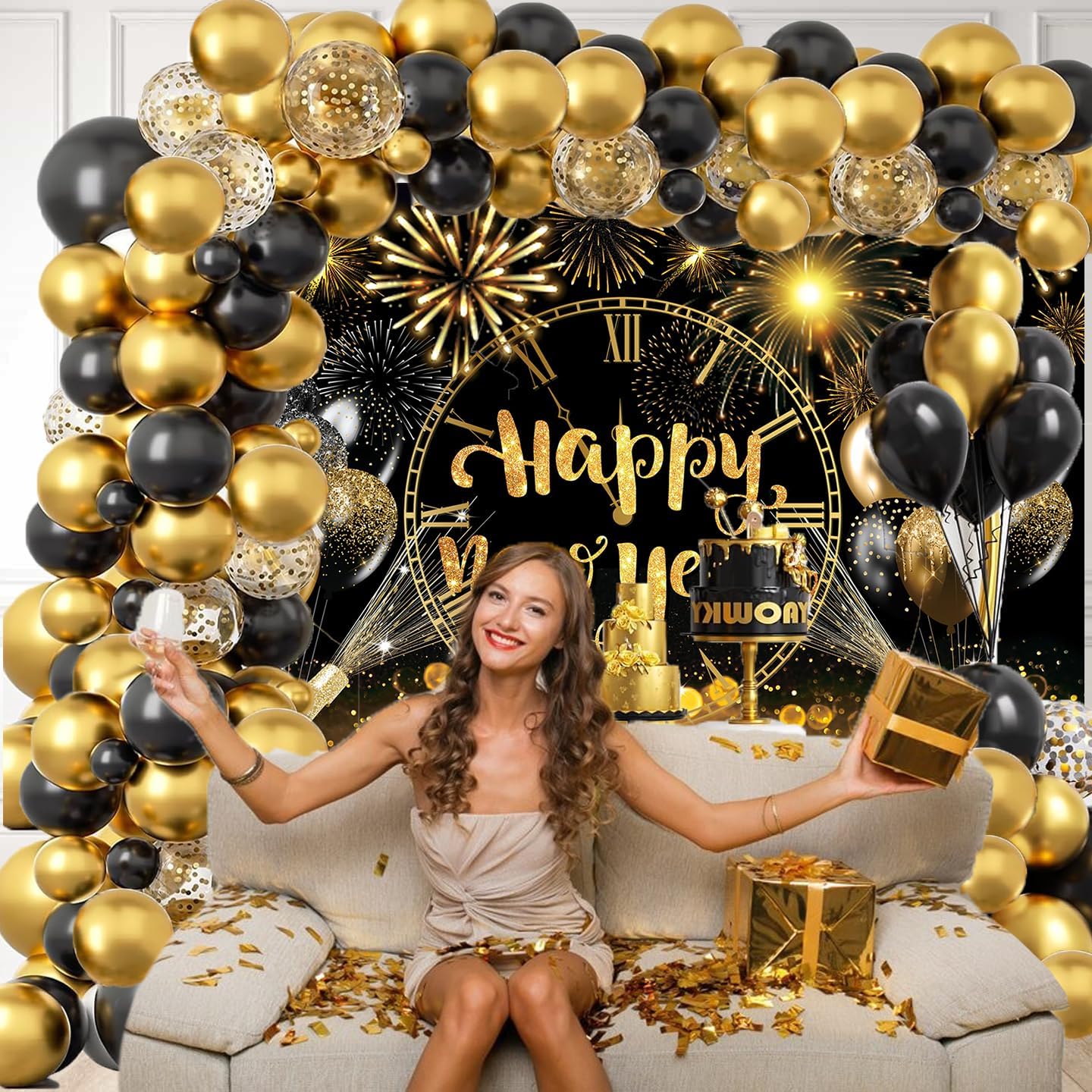 Happy New Year Party Decorations Balloons Set, Include Black and Gold Balloon Garland Arch Kit, Happy New Year Backdrop Banner for NYE Party Supplies