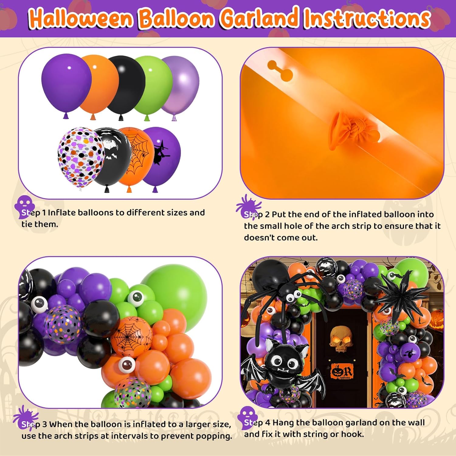 Halloween Balloon Arch Kit: Our set include 176pcs Halloween balloons in different sizes (18”,12”,10”,5”), and this Halloween balloon garland features classic Halloween colors like orange, black, green and purple that will make a spooky yet fun atmosphere