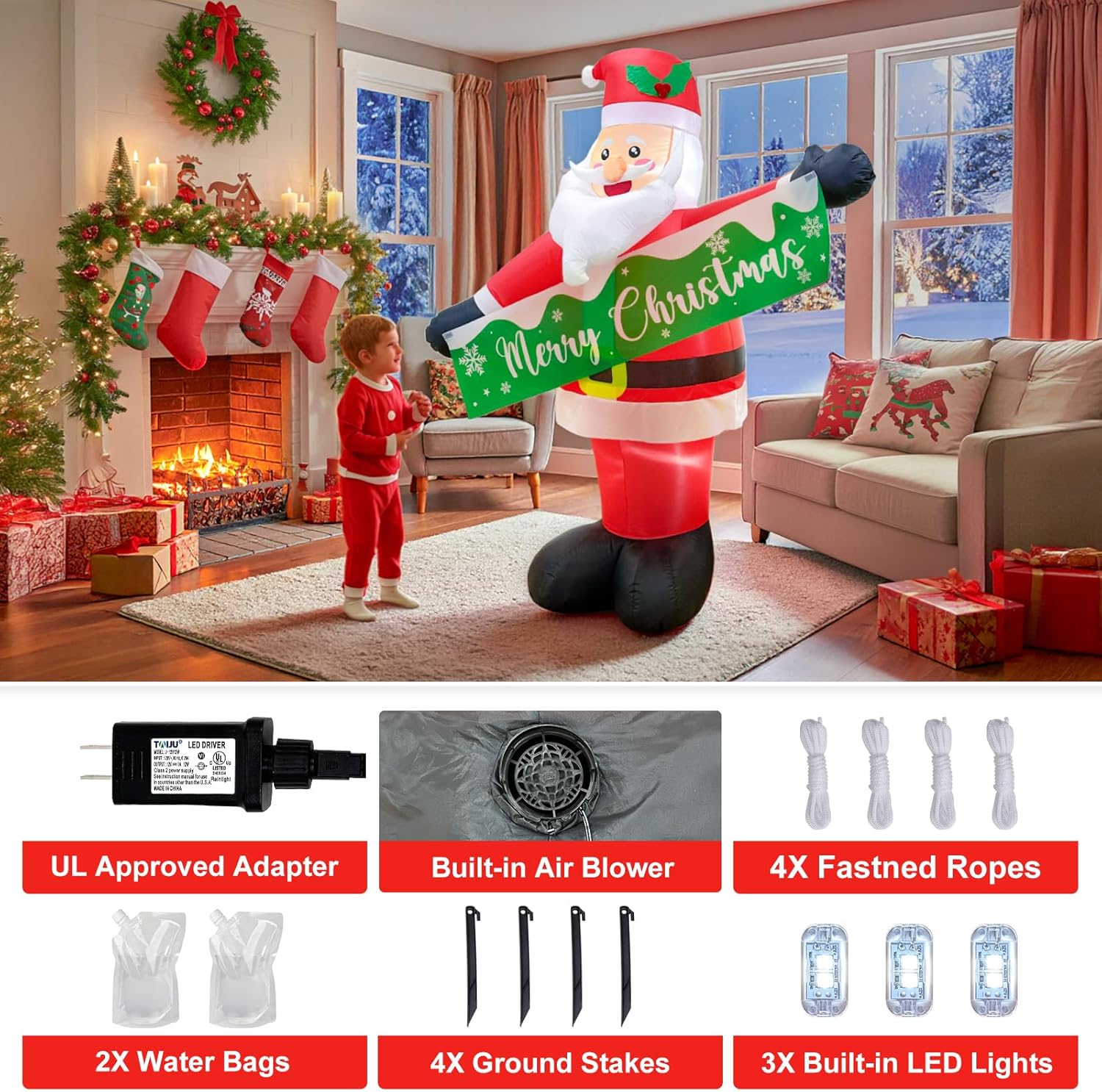 🎅 Festive Santa Claus: These charming 6FT Christmas inflatables feature a classic standing pose with a big smile and a festive “Merry Christmas” banner. The banner is detachable, allowing you to display Santa inflable with or without it, offering two fun and flexible holiday looks for your outdoor display.