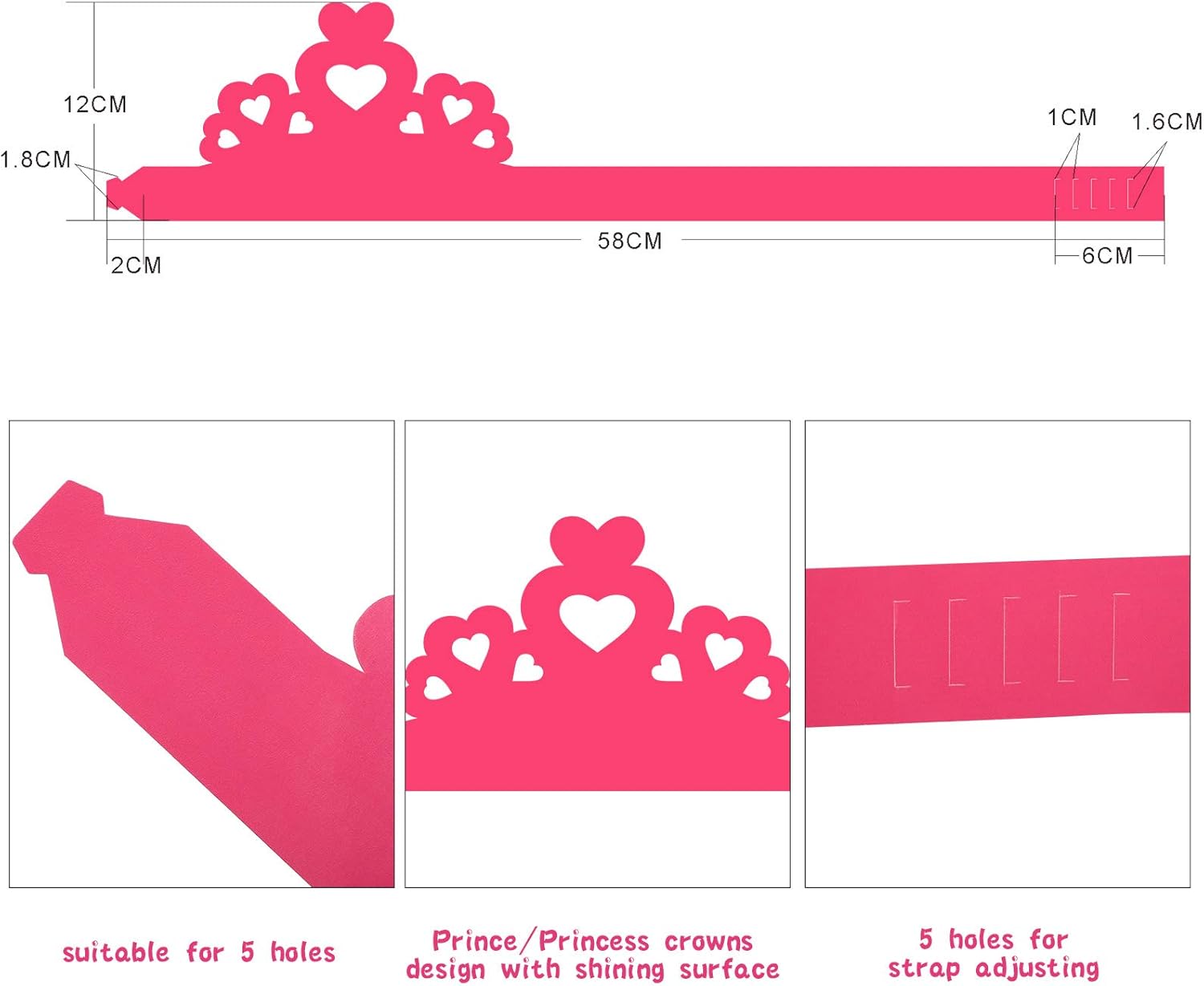 The paper crown tiaras are designed with 5 opening holes, so they are adjustable and easy to fit your head size; Of course, the adjustable design of the paper crowns make them possible to wear by adults.