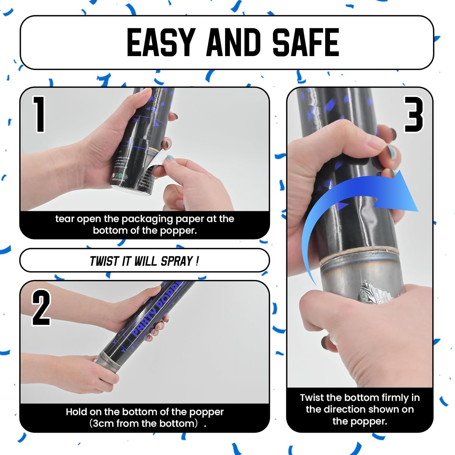 Blue Color Confetti Poppers – Find confetti cannon hard to twist to pop?Maybe you got a wrong way to use confetti poppers. To avoid awkward silence in the beginning, please read the instructions and tear open the packaging paper at the bottom of the popper, then easy to twist it!