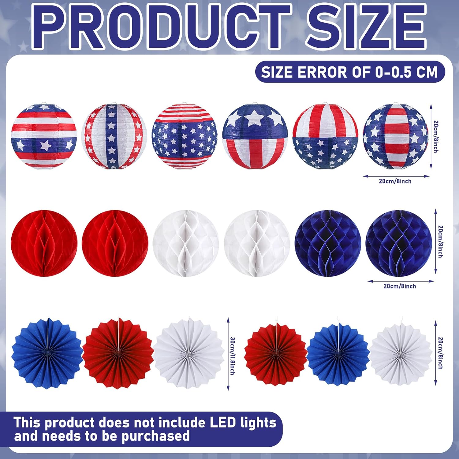 Quality Material: each American flag of hanging lantern and paper honeycomb ball is about 8 inches in diameter, round paper fans is about 7.87 inches, big and eye catching, suitable for indoor and outdoor events; 4th July party decoration paper lantern is made of quality paper and supported by a metal frame, reliable and stable materials are not easy to break, everything are paper products, please open them carefully to avoid contact with water and prevent breakage