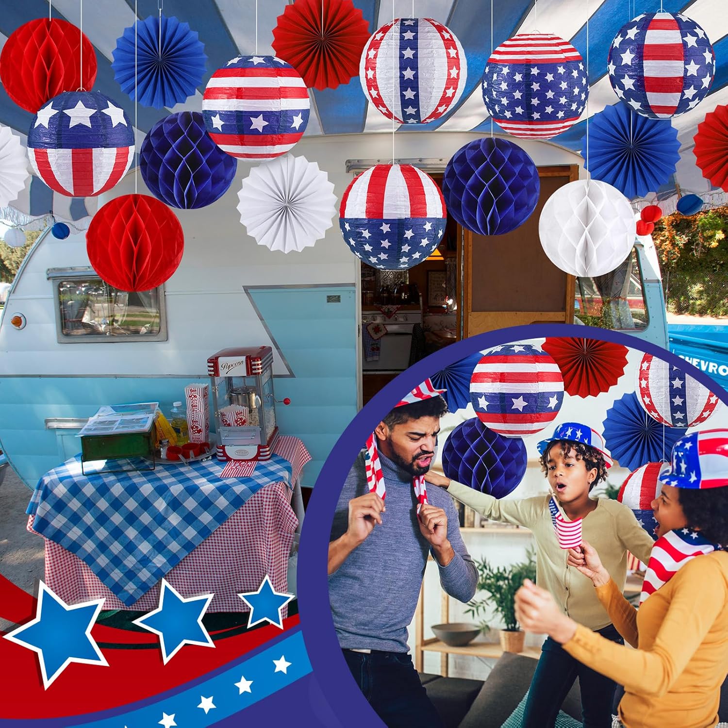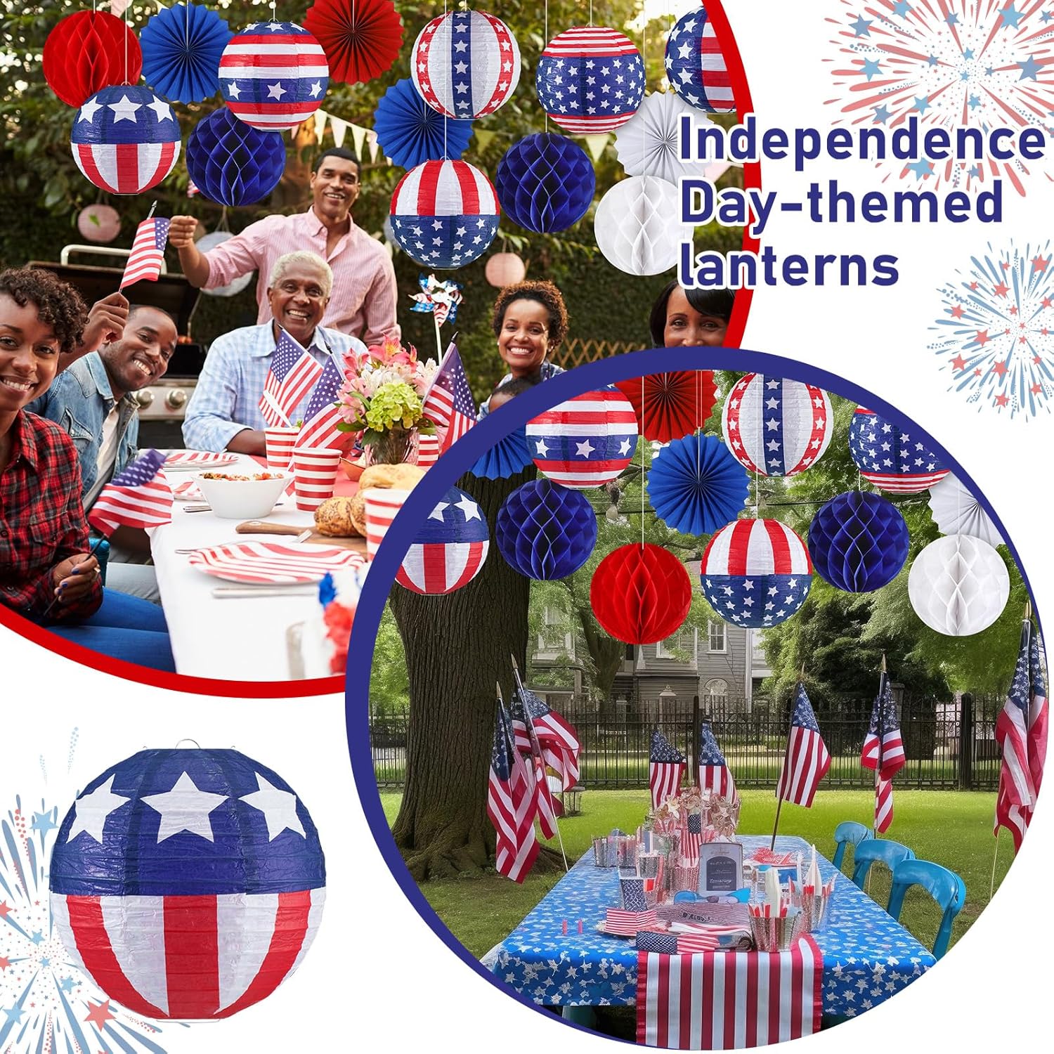 Easy to Install: paper lantern is easy to hang, you just open it and support the outer layer of paper with a metal bracket, then you will get a round paper lantern, also paper honeycomb ball and paper fans only need to be unfolded, simple and quick, most people can easily use this lantern to decorate your patriotic party, welcome your guests to your party
