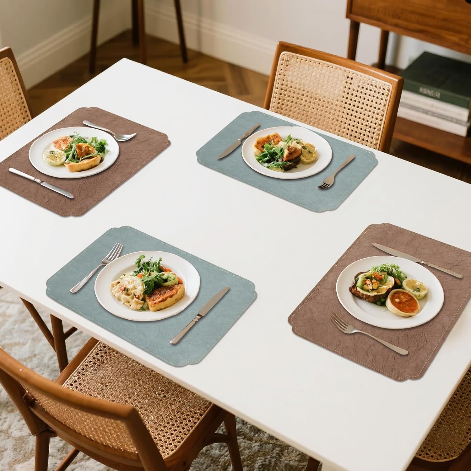Premium Quality and Enduring: The placemats are made of high-quality faux leather and designed for long-term use. With fine craftsmanship, they ensure excellent quality and long-lasting durability, easily protecting your table from scratches and stains and keeping the tabletop clean and new for a long time.