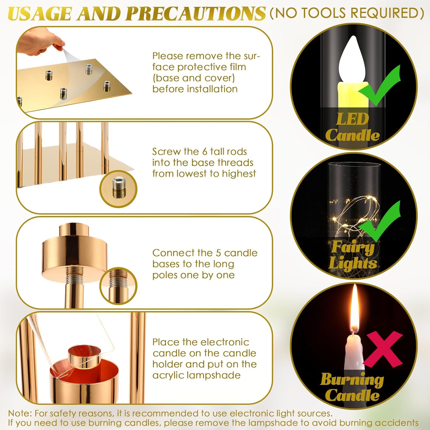 Gold Exquisite Appearance: the 6 arm tall candle holder can hold 0.9″ electronic candles and each comes with a clear acrylic shade; The elegant gilded look of the candelabra pairs perfectly with the glow of the candle and complements the decoration; Note: Please use electronic candles for safety; If you need to use a burning candle, please remove the acrylic cover to avoid burning accidents