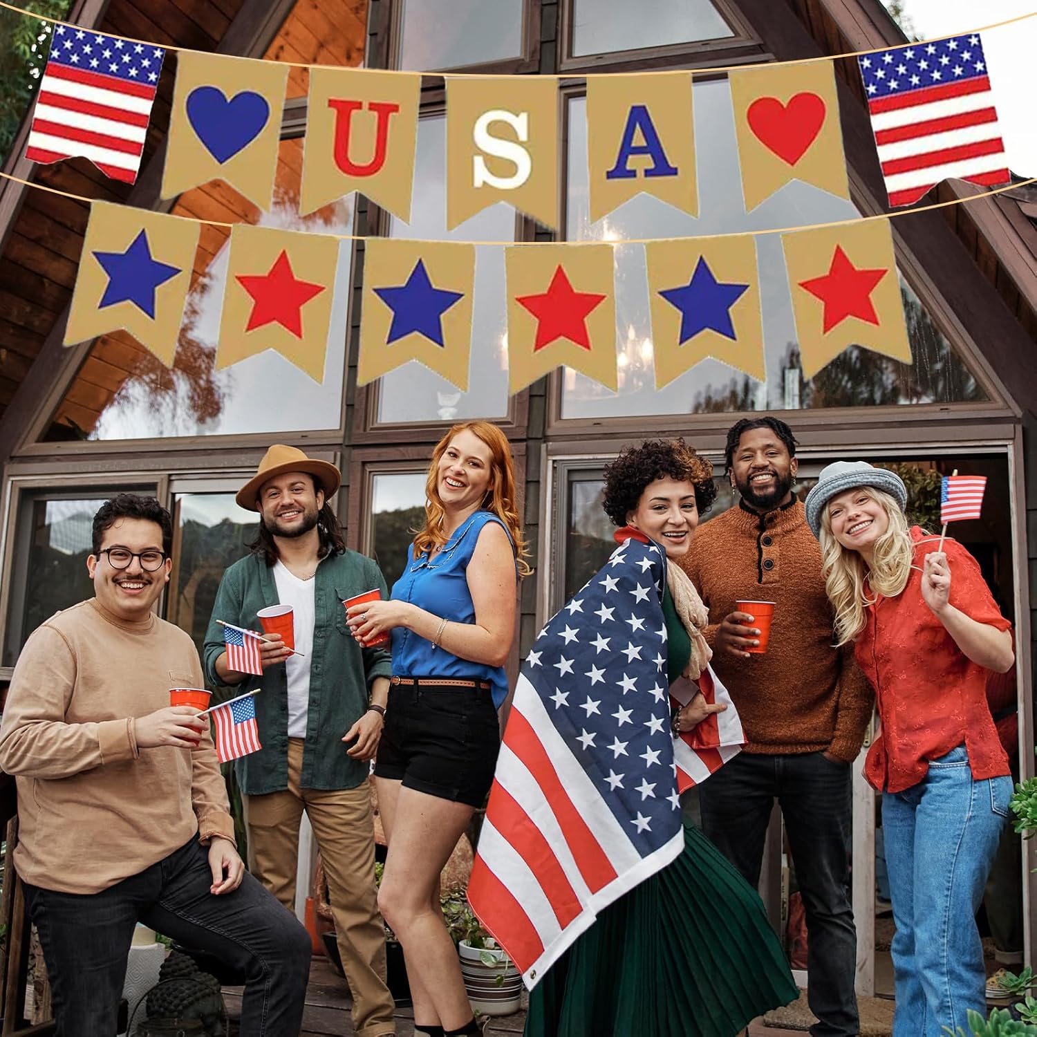 COMPLETE DECORATION BANNER SET: This set includes a pre-strung “USA” banner with heart, star, and American flag pennants, designed to add a rustic and patriotic touch to your 4th of July party, Memorial Day gathering, or Independence Day celebration.