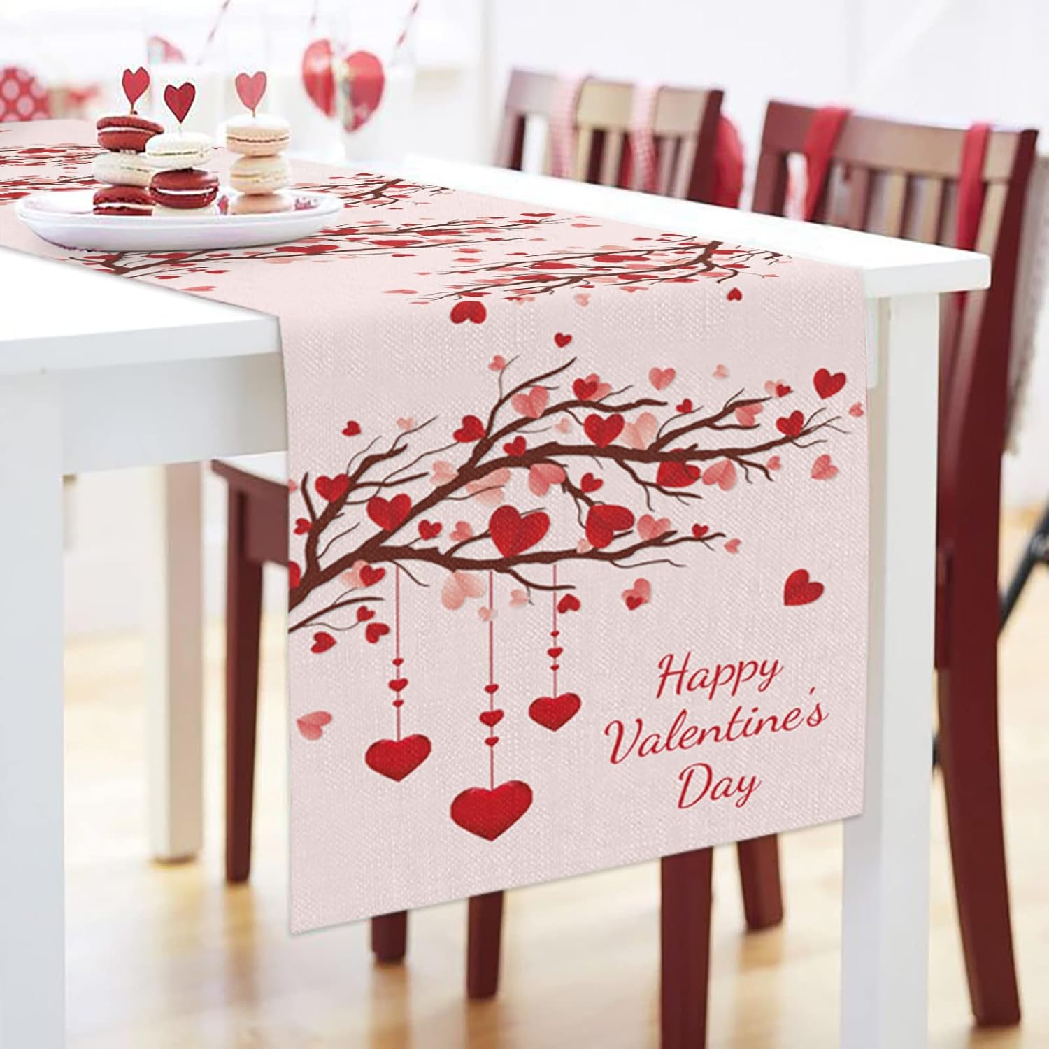 Valentines Day Table Runners 108 Inches Long, Pink, Cotton Linen Table Runner Cloth Dresser Scarves, Valentines Table Decorations for Coffee/Wedding/Holiday/Party/Dining, Romantic Love Heart Tree